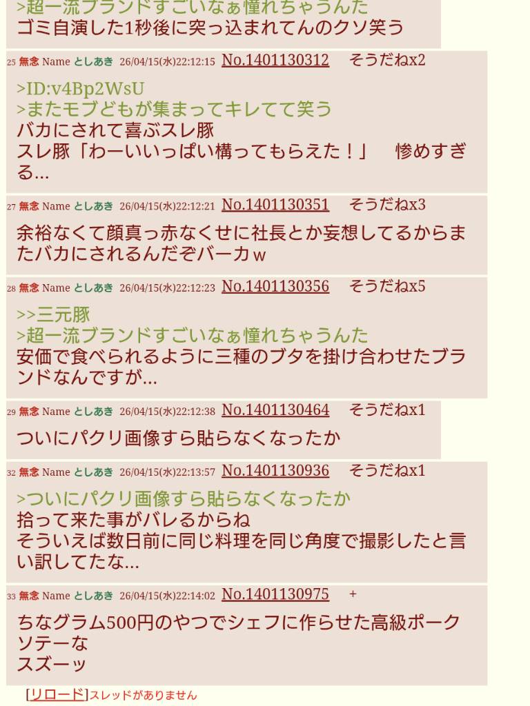 | … | 45無念Nameとしあき26/04/15(水)22:27:17No.1401135700+三元豚を高級って勘違いしてるのも痛いな |