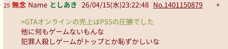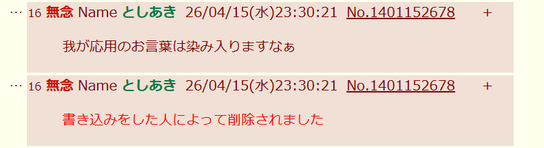 | … | 50無念Nameとしあき26/04/15(水)23:19:31No.1401150079そうだねx3>ID:KHB97ev2 |