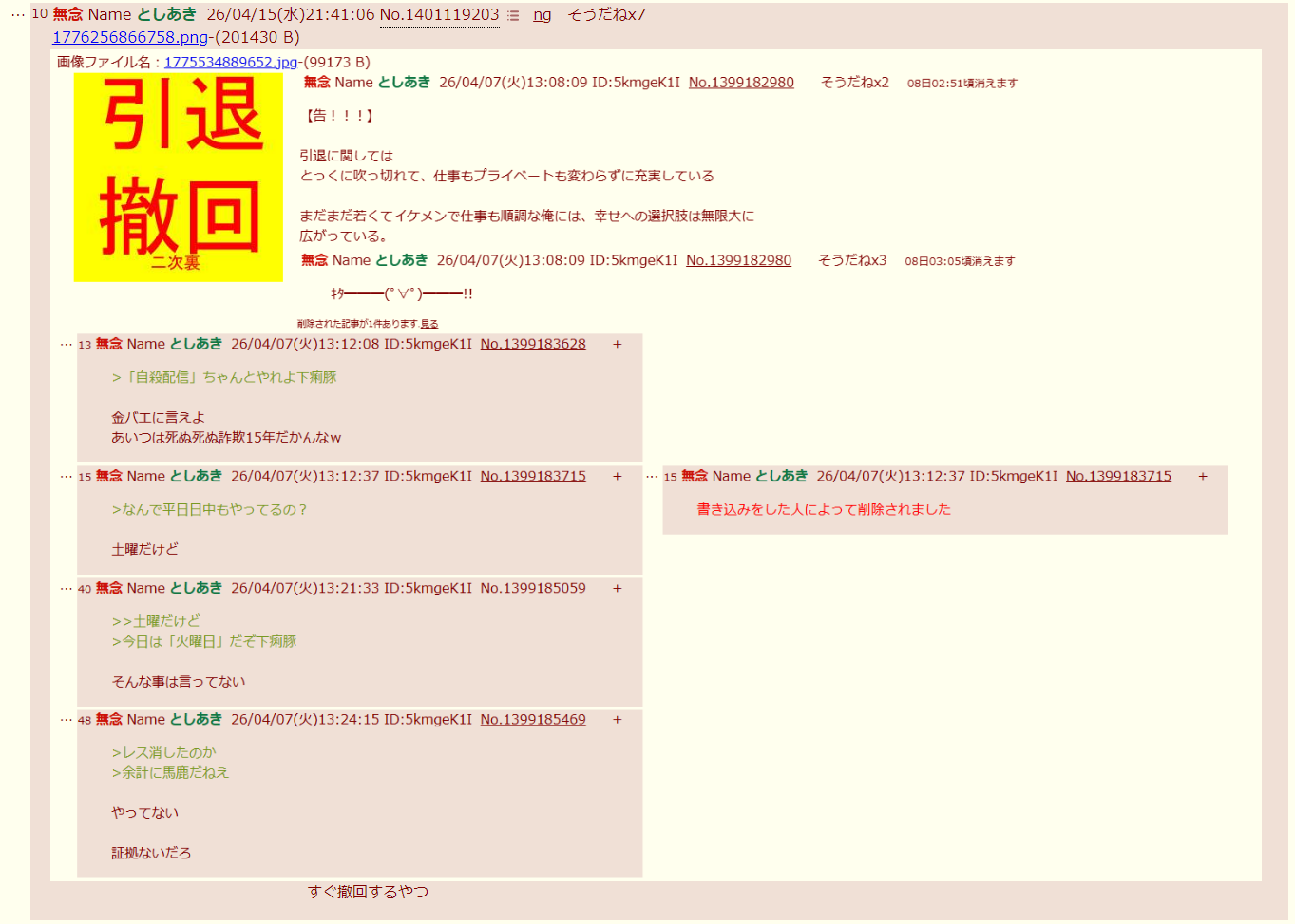 | … | 8無念Nameとしあき26/04/15(水)23:06:42No.1401147012+>この下痢豚を虹裏から追放したい人は「そうだね」を押して下さい |
