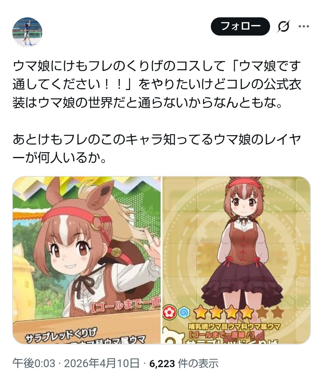 | … | 56無念Nameとしあき26/04/16(木)00:46:44No.1401167600そうだねx3 1776268004522.jpg-(226642 B) そういえば、ウマ娘に迷惑かけようとしてるけもフレコスプレイヤーが居るらしいですね |