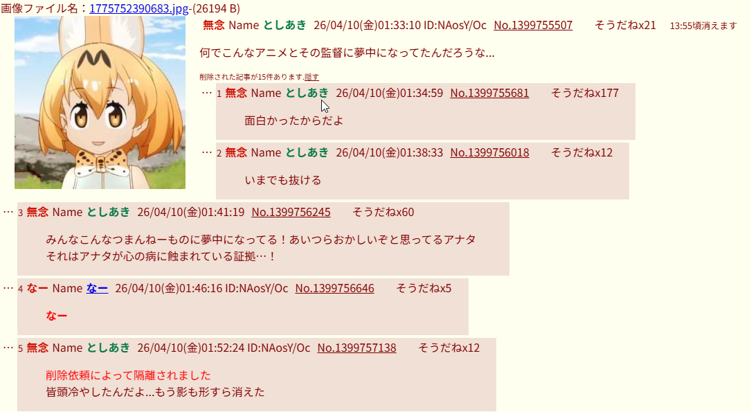 | … | 369無念Nameとしあき26/04/16(木)05:26:30No.1401187438+けもフレ最終回前日に仕事中に涙が止まらなくなった子 |