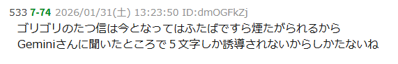 | … | 354無念Nameとしあき26/04/16(木)04:47:56No.1401185869そうだねx1>ぶっちゃけたつきの信者としてmayでやれる活動もたまに立つこう言うスレに乗り込んでスレ虫どうこうスクショペタペタくらいしか無くなってる |