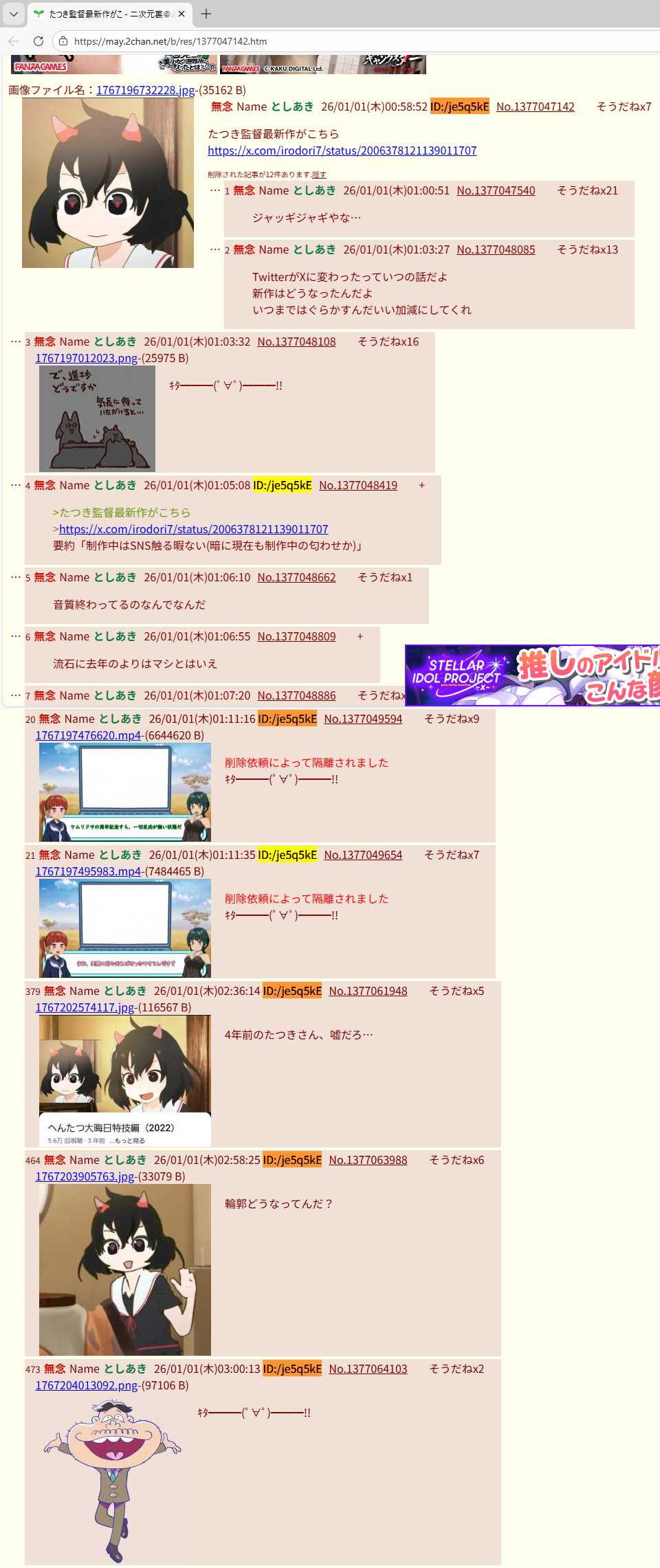 | … | 367無念Nameとしあき26/04/16(木)05:20:49No.1401187218+継続的に作品発表してればまだ応援できたけどねぇ… |