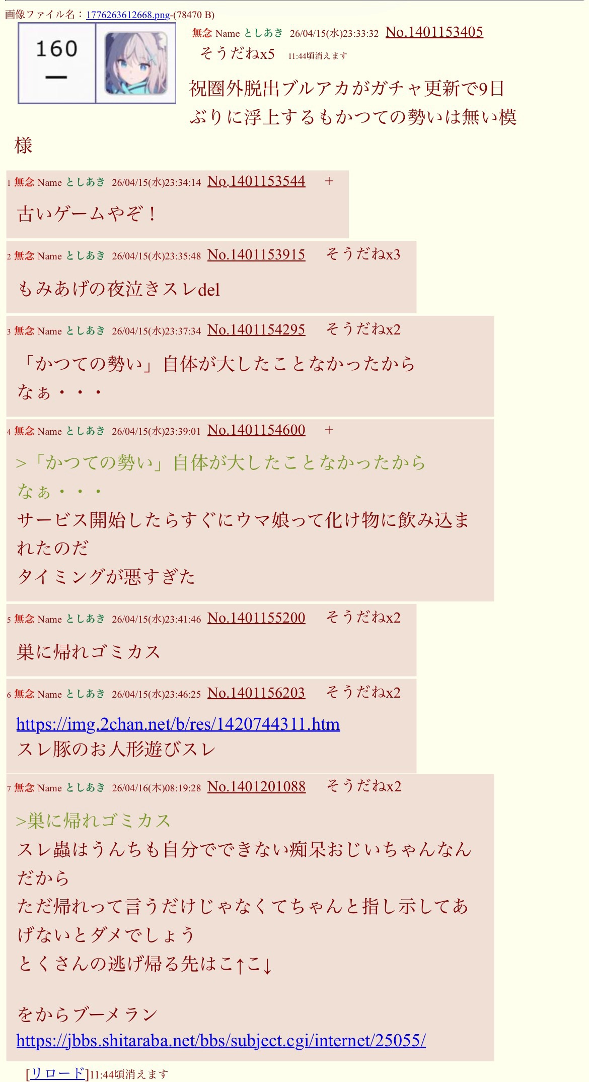 | … | 274無念Nameとしあき26/04/16(木)12:15:51No.1401232447+ブルアカもリダイブしようぜ! |