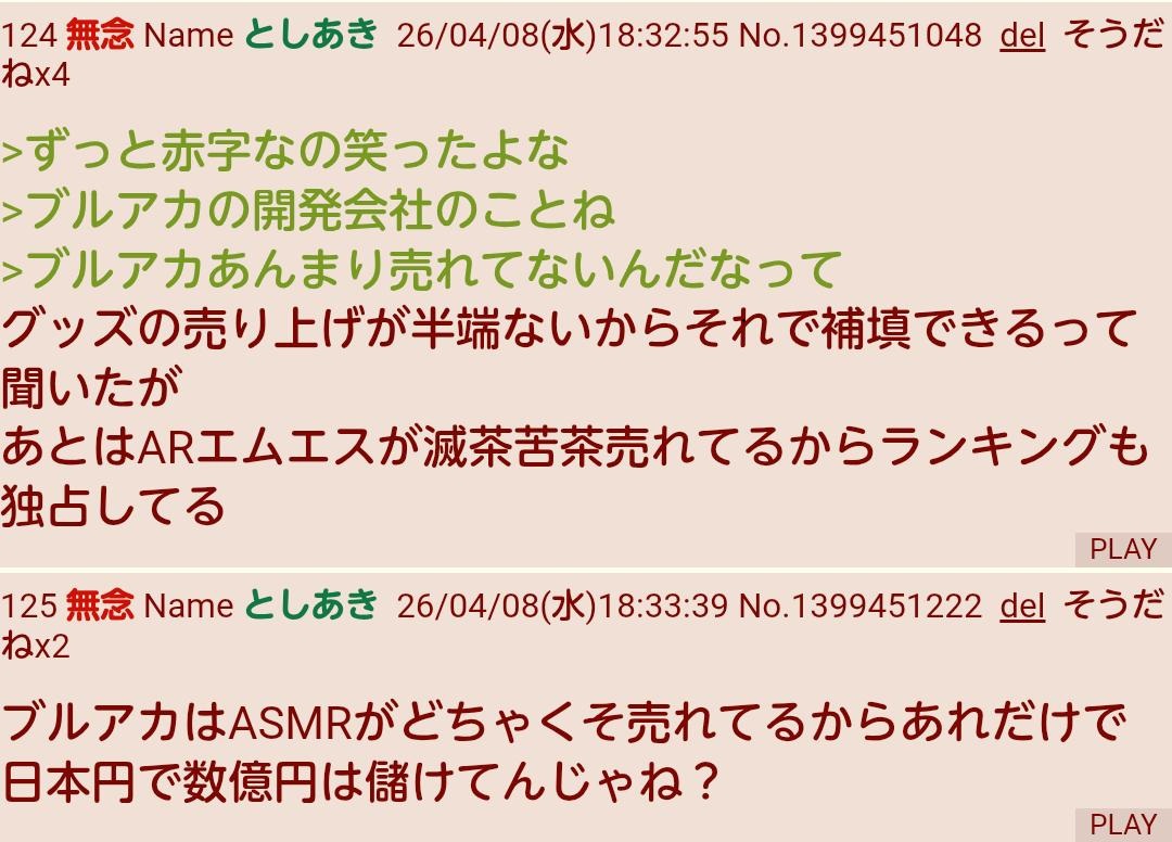 | … | 226無念Nameとしあき26/04/16(木)11:59:06No.1401229395+まぁブルアカはヨスタに上納しないといけないんだが… |