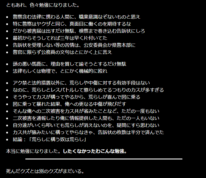 | … | 81無念Nameとしあき26/04/16(木)15:50:02No.1401269464そうだねx7 1776322202262.png-(143229 B) あんな経緯で住所とかバレたのを警察に相談するとか恥ずかしくないんかな |
