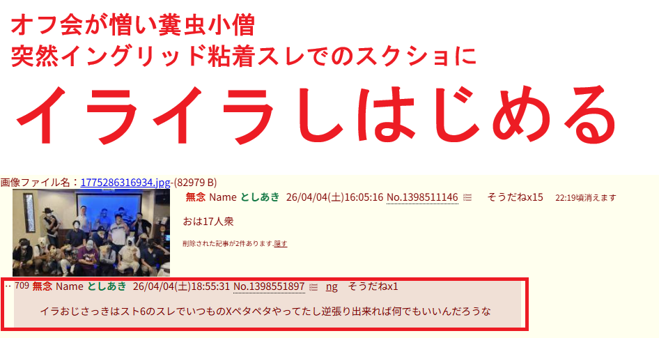 | … | 321無念Nameとしあき26/04/16(木)17:36:54No.1401285972そうだねx4使い古されたコラ画像のリサイクルしかできないからソンキ派からも30回線派からも受け入れてもらえないイラおじに居場所はあるのだろうか |