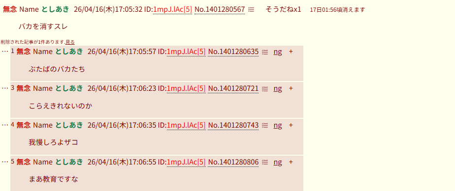 | … | 263無念Nameとしあき26/04/16(木)17:01:05No.1401279856+スレ豚だけじゃない第三者()の俺たち()もいる!と喚きながら |