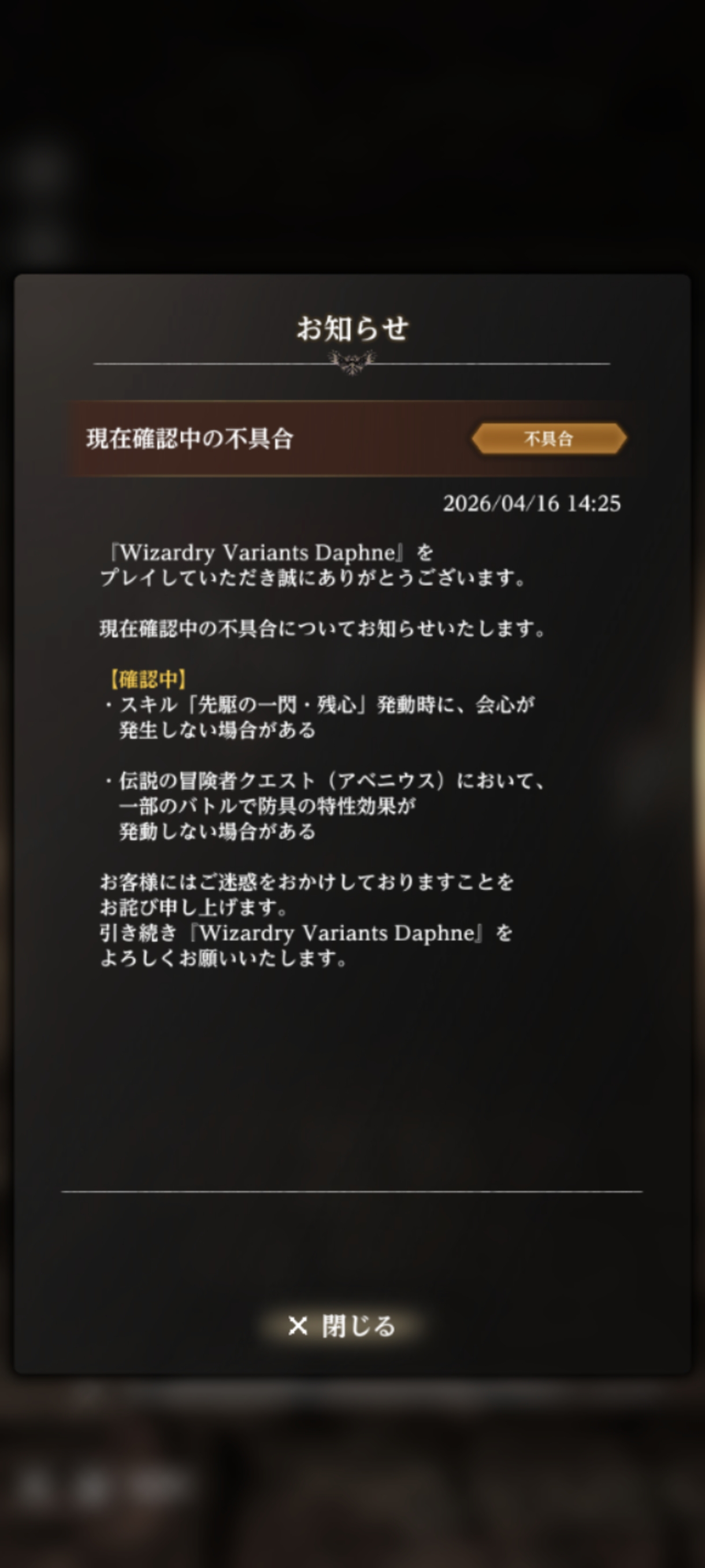 | … | 32無念Nameとしあき26/04/16(木)15:00:44 ID:PyfPhuy.No.1401261616+>・スキル「先駆の一閃・残心」発動時に、会心が発生しない場合がある |