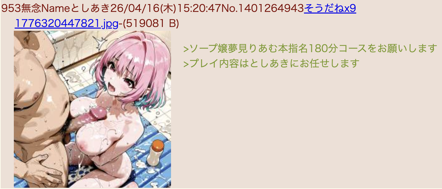 | … | 634無念Nameとしあき26/04/16(木)18:37:19No.1401298274+ 1776332239042.png-(647052 B) 前スレのソープ嬢夢見りあむ本指名180分コースをありがとうございました! |