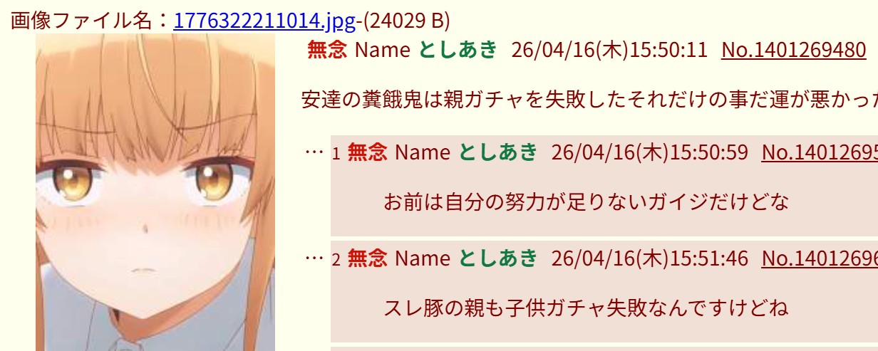 | … | 2無念Nameとしあき26/04/16(木)15:51:46No.1401269675そうだねx9スレ豚の親も子供ガチャ失敗なんですけどね |