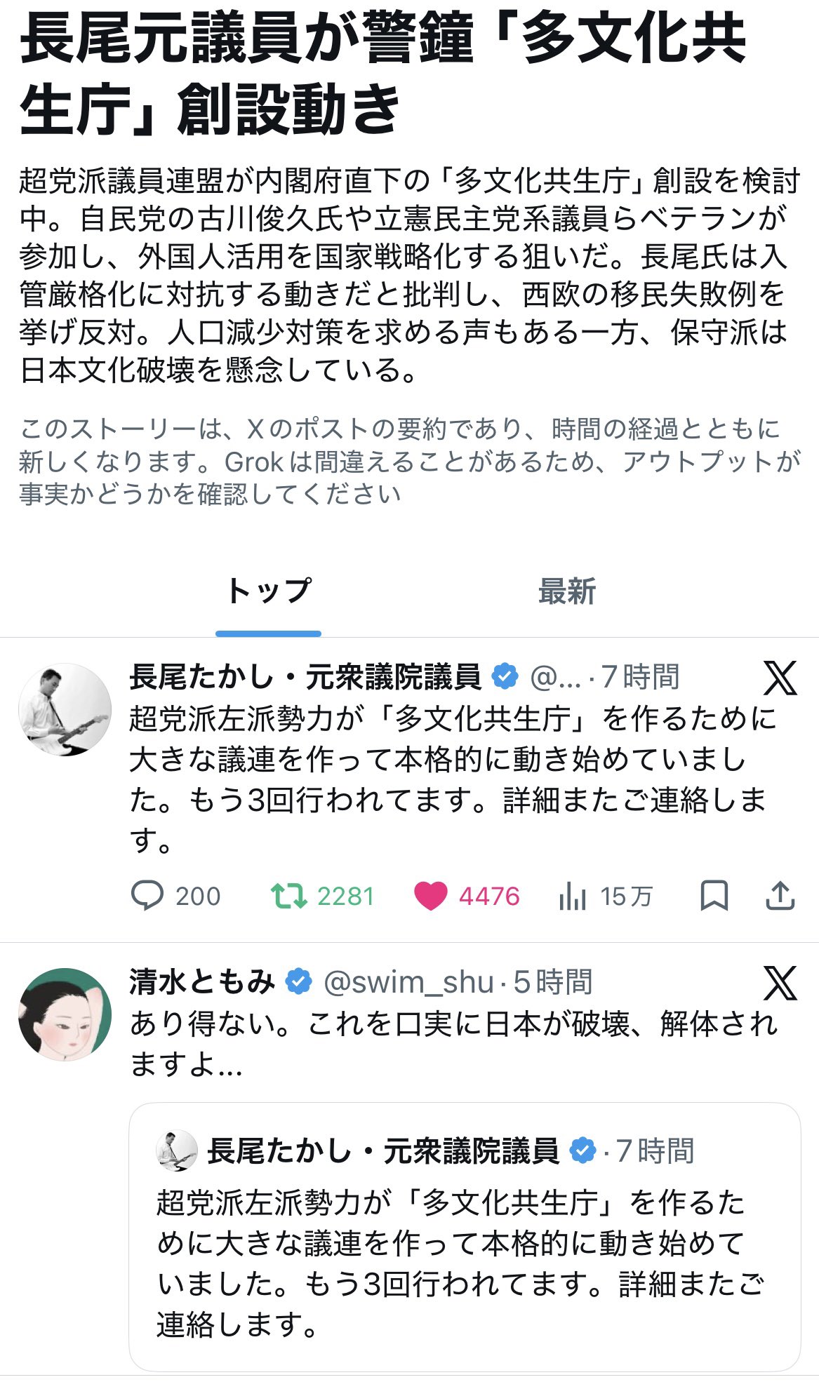 | … | 121無念Nameとしあき26/04/16(木)23:47:40No.1401378098+自民党が移民推進してるのに野党もやってるで票入れるならそれ移民に加担してるのと一緒ですよ |
