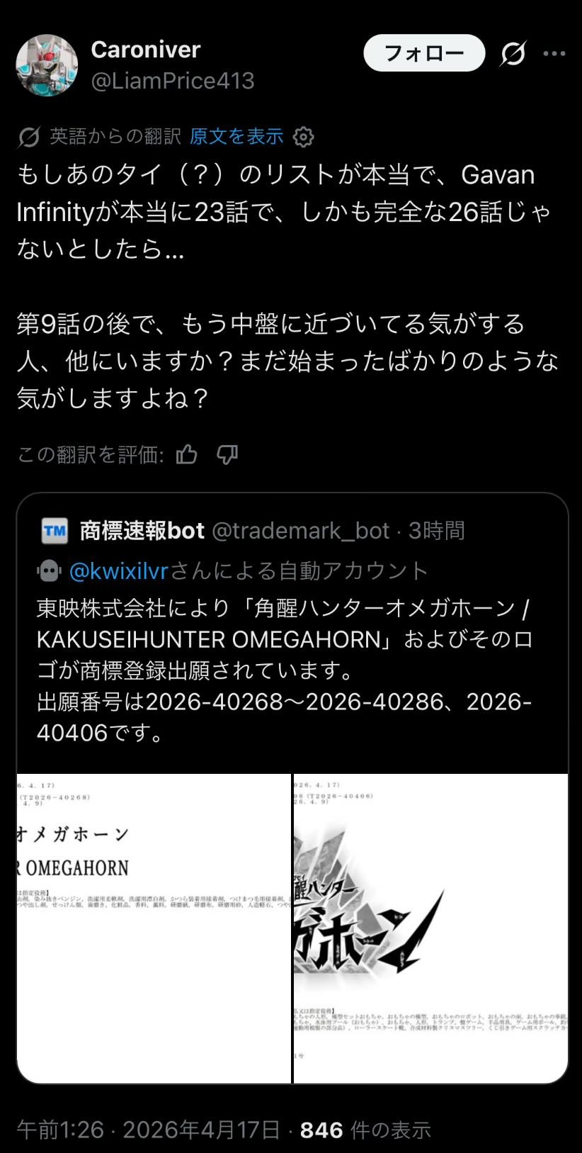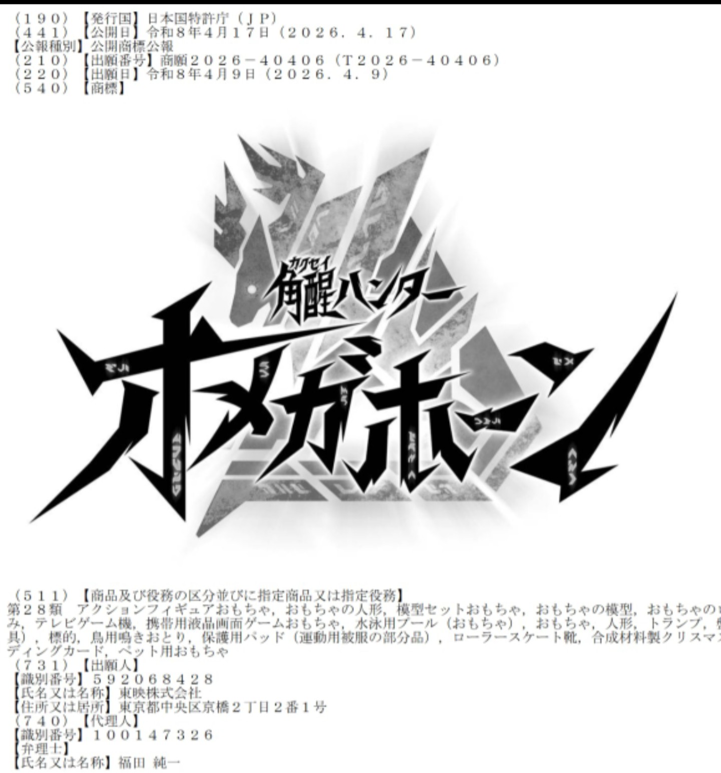 | … | 1無念Nameとしあき26/04/17(金)07:03:27No.1401406733そうだねx1 1776377007100.jpg-(214319 B) 今日の朝に東映から出願が確認された謎の商標 |