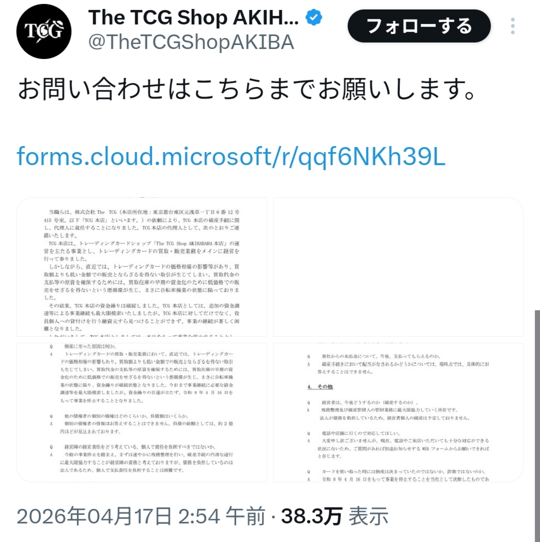| … | 11無念Nameとしあき26/04/17(金)08:33:49No.1401415734そうだねx1>なんか秋葉原のカードショップが破産してえらいこっちゃらしいな… |