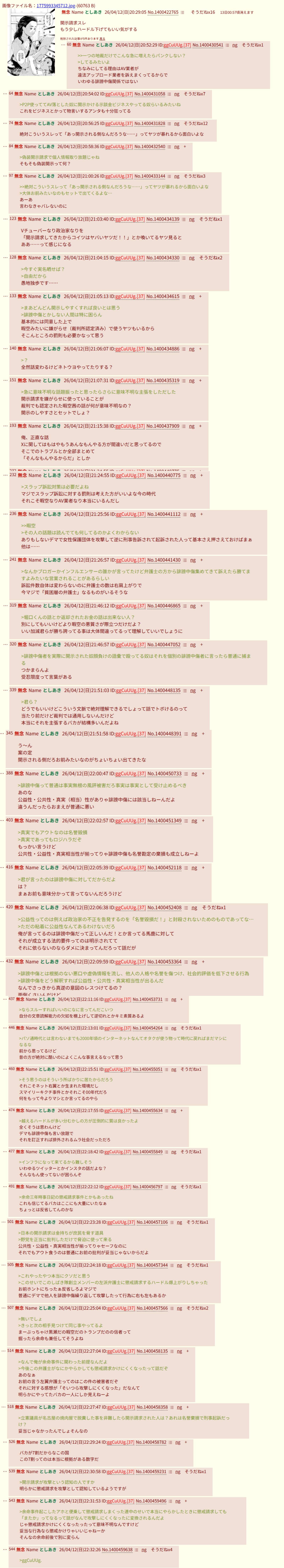 | … | 100無念Nameとしあき26/04/17(金)17:30:20No.1401492543そうだねx1>司法で大敗してることより二次裏で隔離やID出される方が大罪だもんな暇空界隈では |