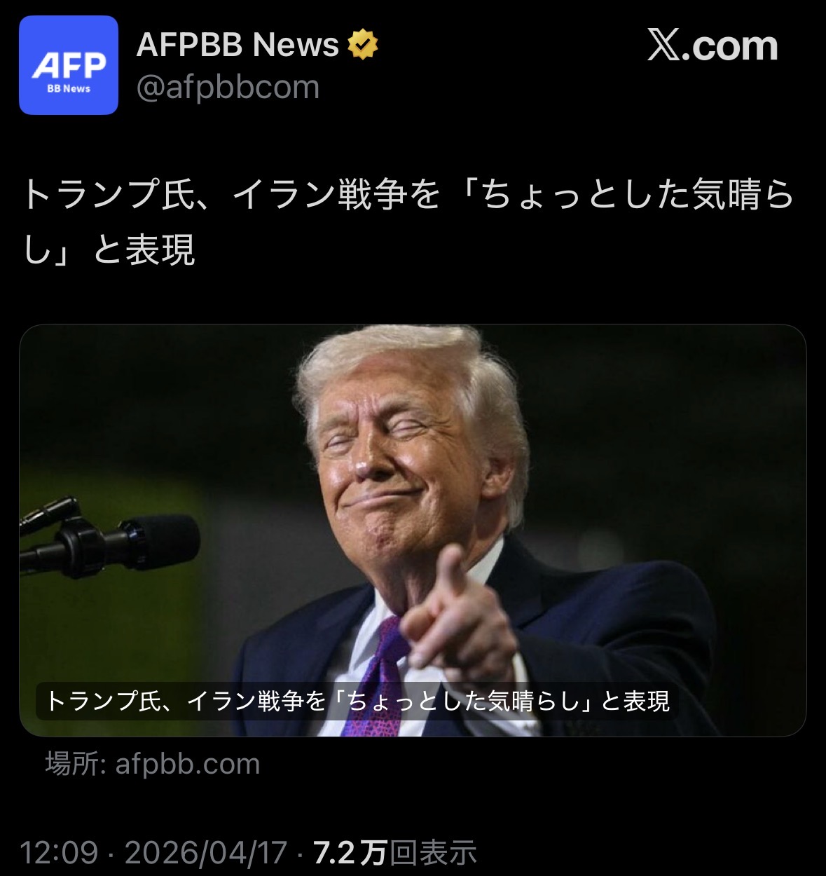 | … | 21無念Nameとしあき26/04/17(金)15:05:45No.1401470979そうだねx1>トランプ氏イラン戦争をちょっとした気晴らしと表現 |