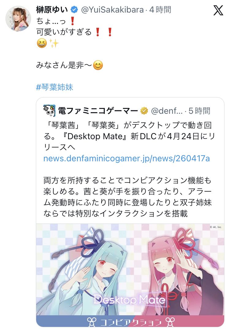 | … | 2無念Nameとしあき26/04/17(金)19:01:59No.1401511413+ 1776420119761.jpg-(100827 B) デスクトップメイトに琴葉姉妹登場 |