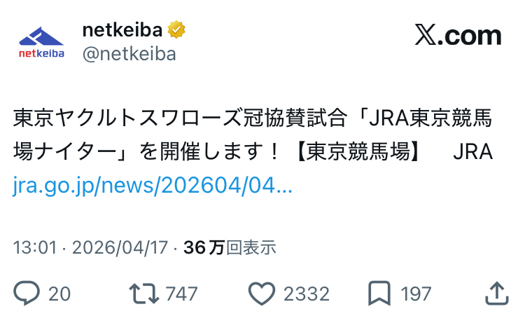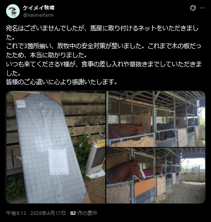 | … | 10無念Nameとしあき26/04/17(金)20:10:44No.1401528734そうだねx10 1776424244201.jpg-(90393 B) 【NNMD2026🐴4/16‐5/15】昨日4/16 #ナイスネイチャ の誕生日から始まったNNMD2026にあたたかなご支援をありがとうございます。19時現在、ご参加者数は2900名を超え、3000名近くの方々から目標の2500万円の62%、1500万円以上のご支援をいただいています。みなさまに心より感謝申し上げます。 ドネーションは5/15まで開催します。引き続きよろしくお願いいたします! |
