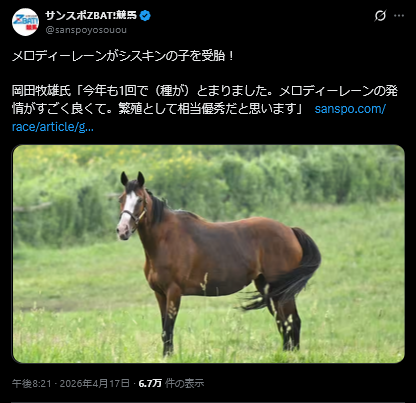 | … | 61無念Nameとしあき26/04/17(金)20:59:24No.1401543593+>向こうの産駒に英金杯をレコード勝ちしたトローラーマンがいるぽんが残念ながらタマタマグッバイしてたぽん… |