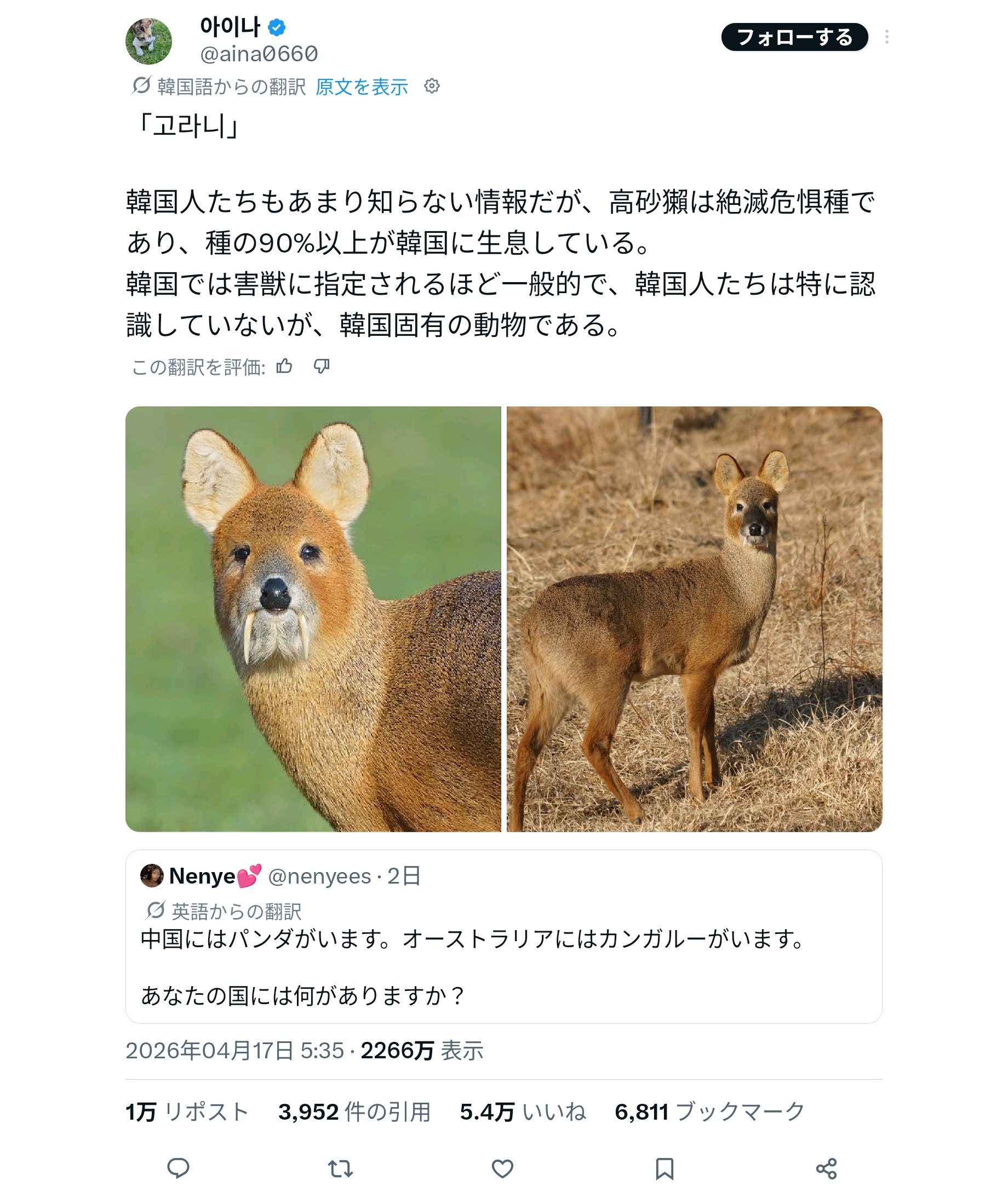 | … | 39無念Nameとしあき26/04/19(日)11:14:24No.1401920971+>>Xで自分たちの国固有の動物紹介していこうぜ〜ってなった時スレ画が上がった |
