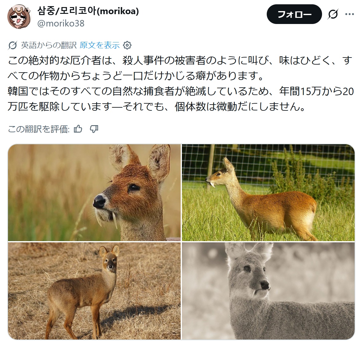 | … | 74無念Nameとしあき26/04/19(日)11:51:49No.1401928589+キョンといいニホンジカといいシカ科はやべー害獣しか居ないのか… |
