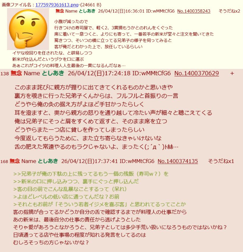 | … | 89無念Nameとしあき26/04/19(日)13:24:02No.1401949194そうだねx3>店長には店畳むか土下座するか指示 |