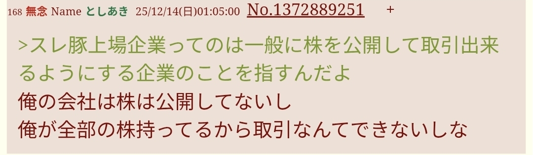 | … | 204無念Nameとしあき26/04/19(日)13:58:38No.1401956721そうだねx6非公開で社長()の100%持ち株()で誰に向けて“株主”総会やるんだよ… |