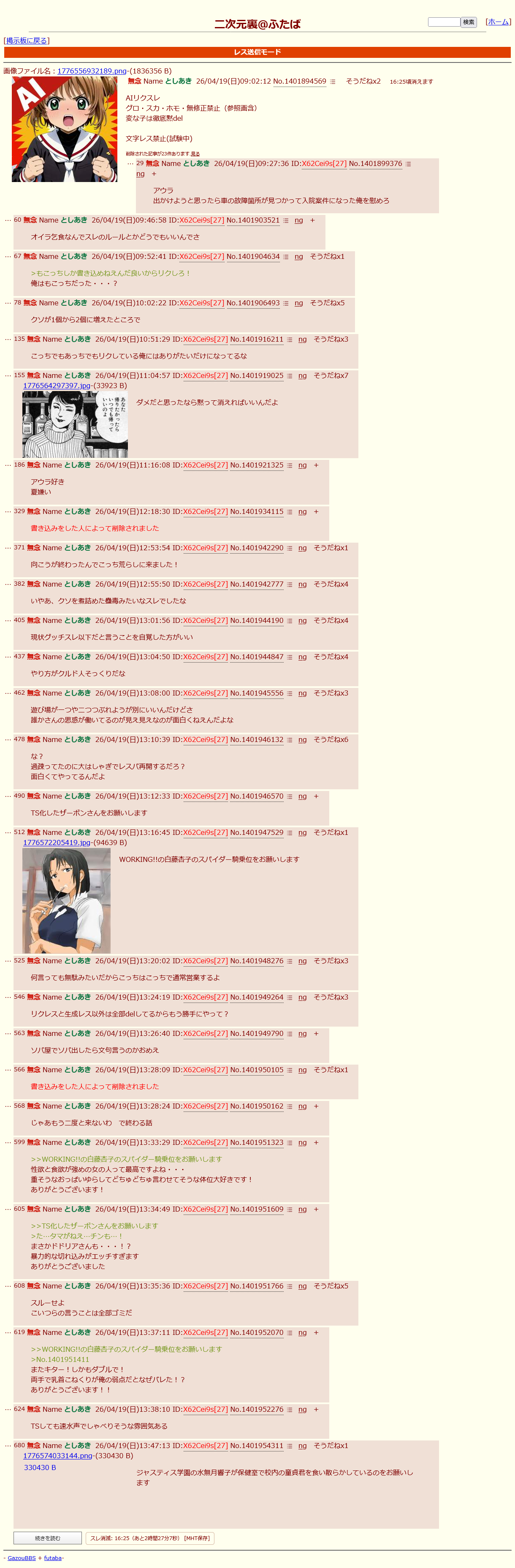 | … | 26無念Nameとしあき26/04/19(日)13:36:53No.1401952020+文字レス禁止スレであの振る舞いするの |