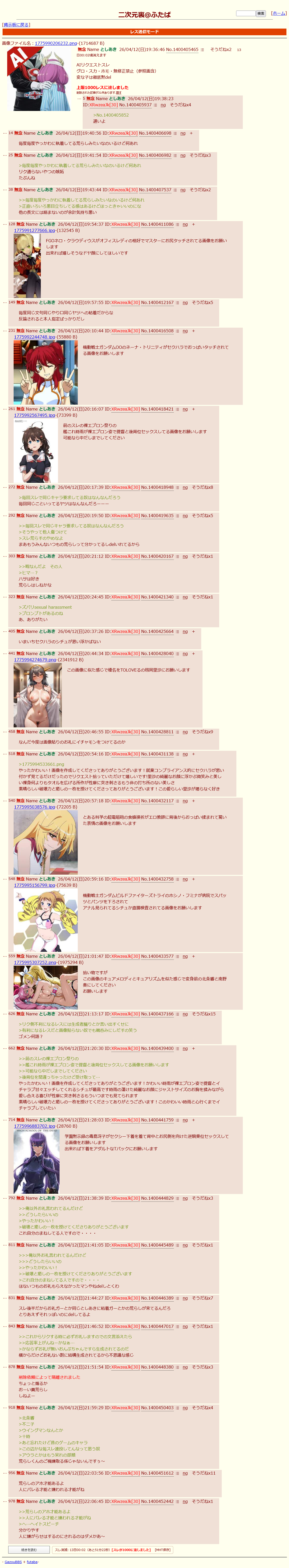 | … | 370無念Nameとしあき26/04/19(日)14:48:05No.1401967326+冷静に考えたら知らんおじさんのためにせっせとエロ画像を生成するのは正気を失ってるので |