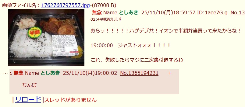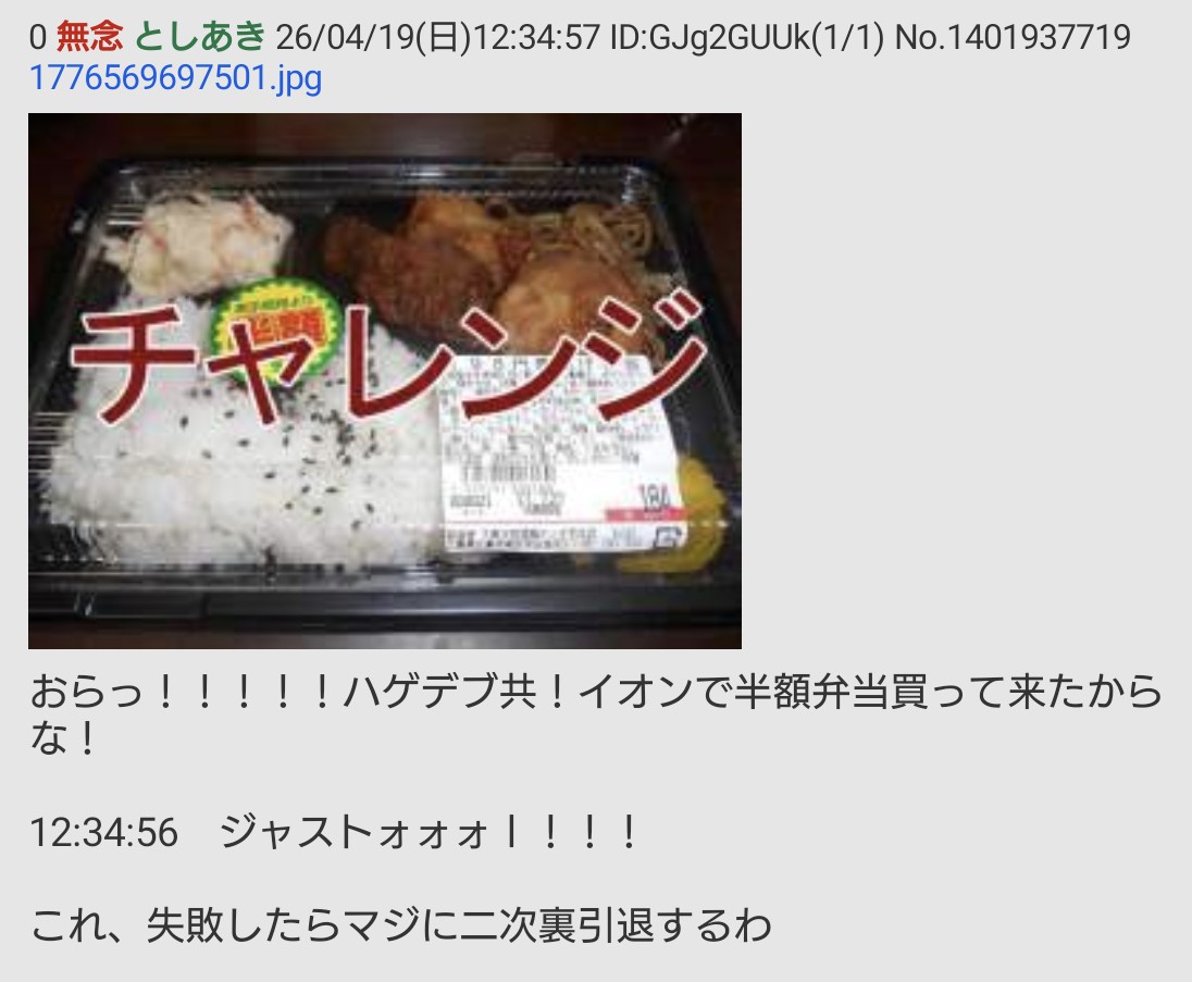 | … | 87無念Nameとしあき26/04/19(日)19:20:44No.1402035825そうだねx8弁当失敗したんだ まあイオンの半額弁当買いに行けてないから |