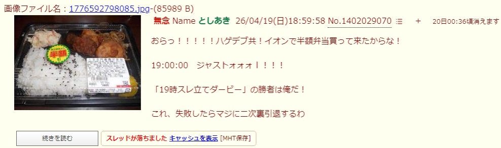 | … | 50無念Nameとしあき26/04/19(日)19:13:19No.1402033451そうだねx3>>弁当ダービー(笑)はどうした? |