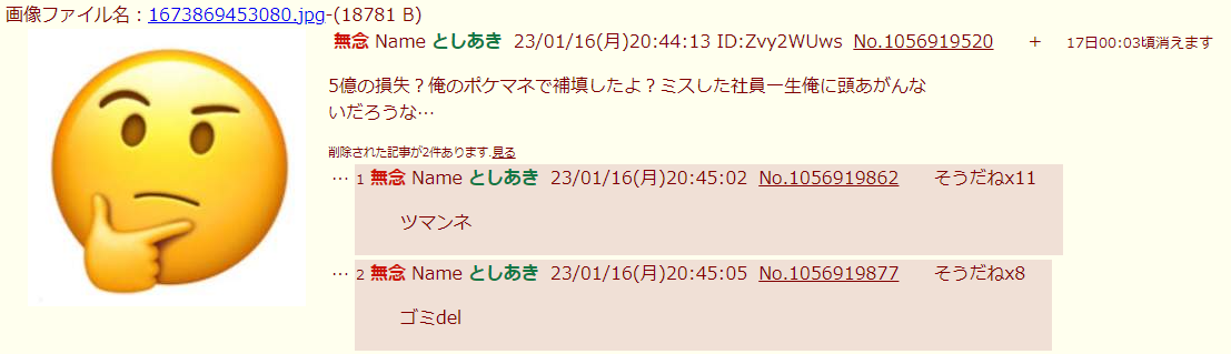| … | 208無念Nameとしあき26/04/19(日)20:00:39No.1402049057+ 1776596439653.jpg-(839105 B) >言い返せなくなるとテキトーなレスを返して「おまわりさん来なかったから俺の勝ち」と逃げるんでしょ損気って |