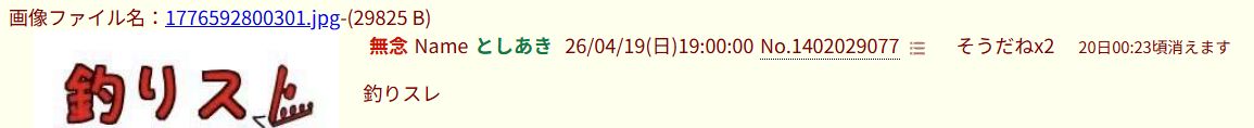 | … | 94無念Nameとしあき26/04/19(日)19:22:23No.1402036345そうだねx2>ID:rBc65ne2 |