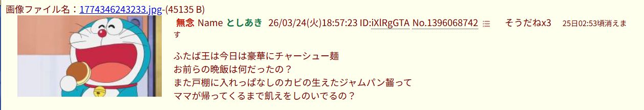 | … | 199無念Nameとしあき26/04/19(日)19:57:42No.1402048078そうだねx1>だって豪華な食事がチャーシュー麵だぜ? |