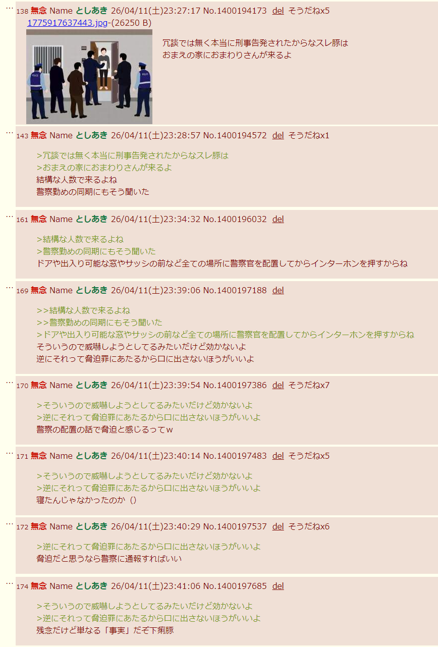 | … | 243無念Nameとしあき26/04/19(日)21:03:37No.1402070120+>自分でも逮捕される可能性があるという認識はあるのか |