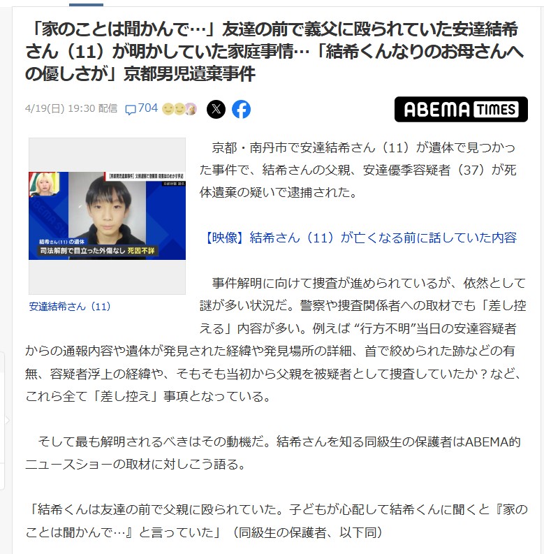 | … | 62無念Nameとしあき26/04/19(日)20:51:33 ID:CEAxPNPANo.1402066228+ 1776599493202.jpg-(140253 B) 「家のことは聞かんで…」友達の前で義父に殴られていた安達結希さん(11)が明かしていた家庭事情…「結希くんなりのお母さんへの優しさが」京都男児遺棄事件 |