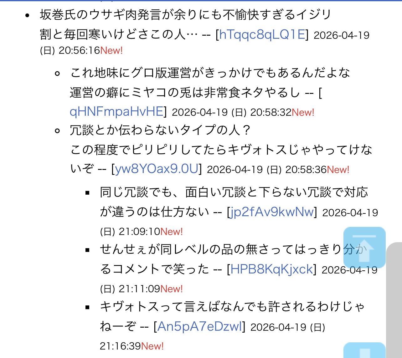 | … | 125無念Nameとしあき26/04/20(月)00:42:05No.1402126018+>まあ運営がこんなクソカスな醜態を何度も晒しても炎上しないのは本当にお行儀がいいというか民度が高いと思うよ |