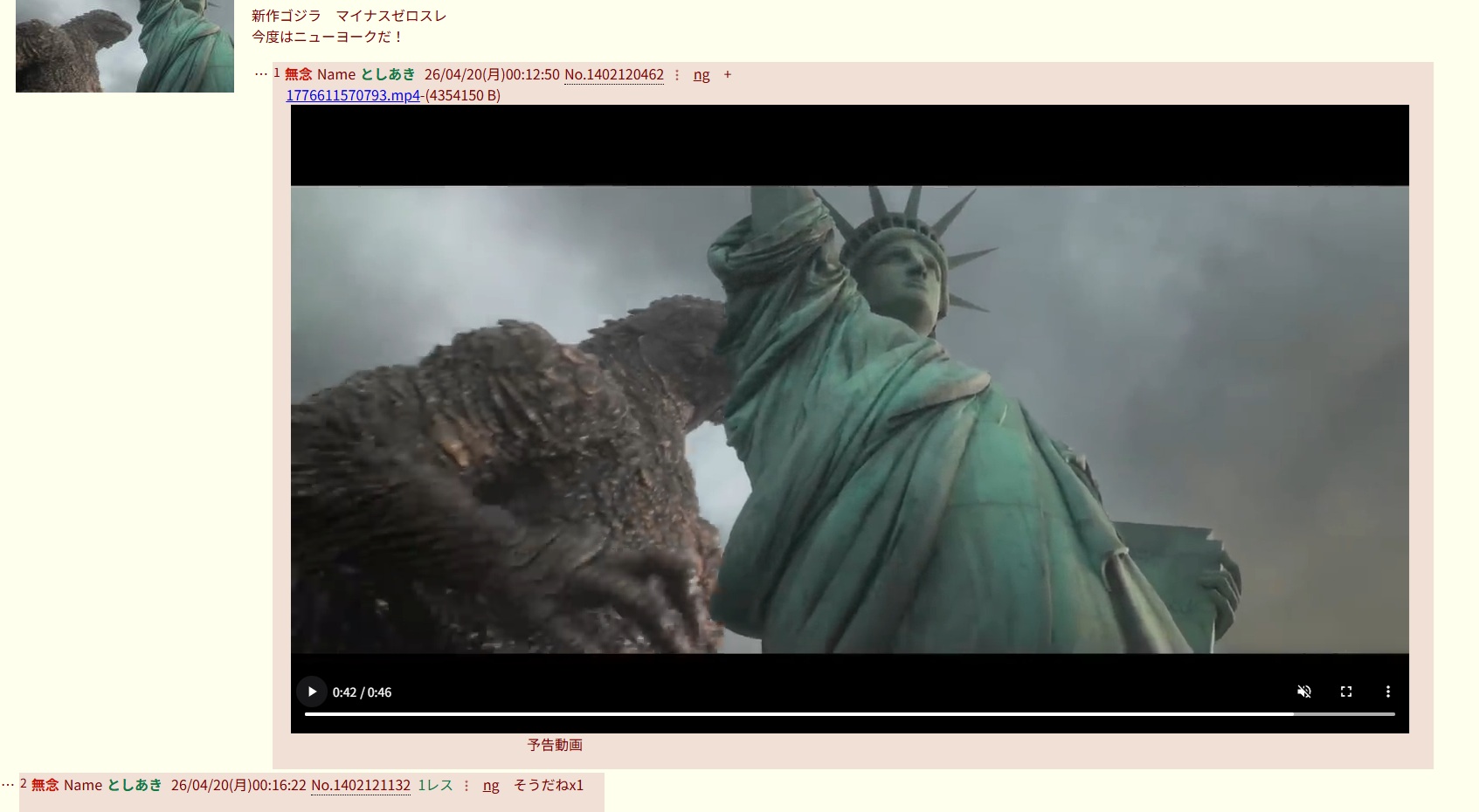 | … | 36無念Nameとしあき26/04/20(月)01:07:34No.1402129886+>ゴジラ小さすぎワラタ |