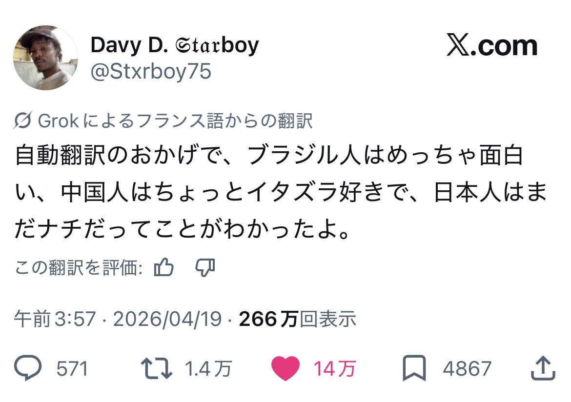 | … | 83無念Nameとしあき26/04/20(月)03:02:29No.1402139074+翻訳機能の向上でネトウヨみたいな馬鹿が居ることが世界にバレたな |