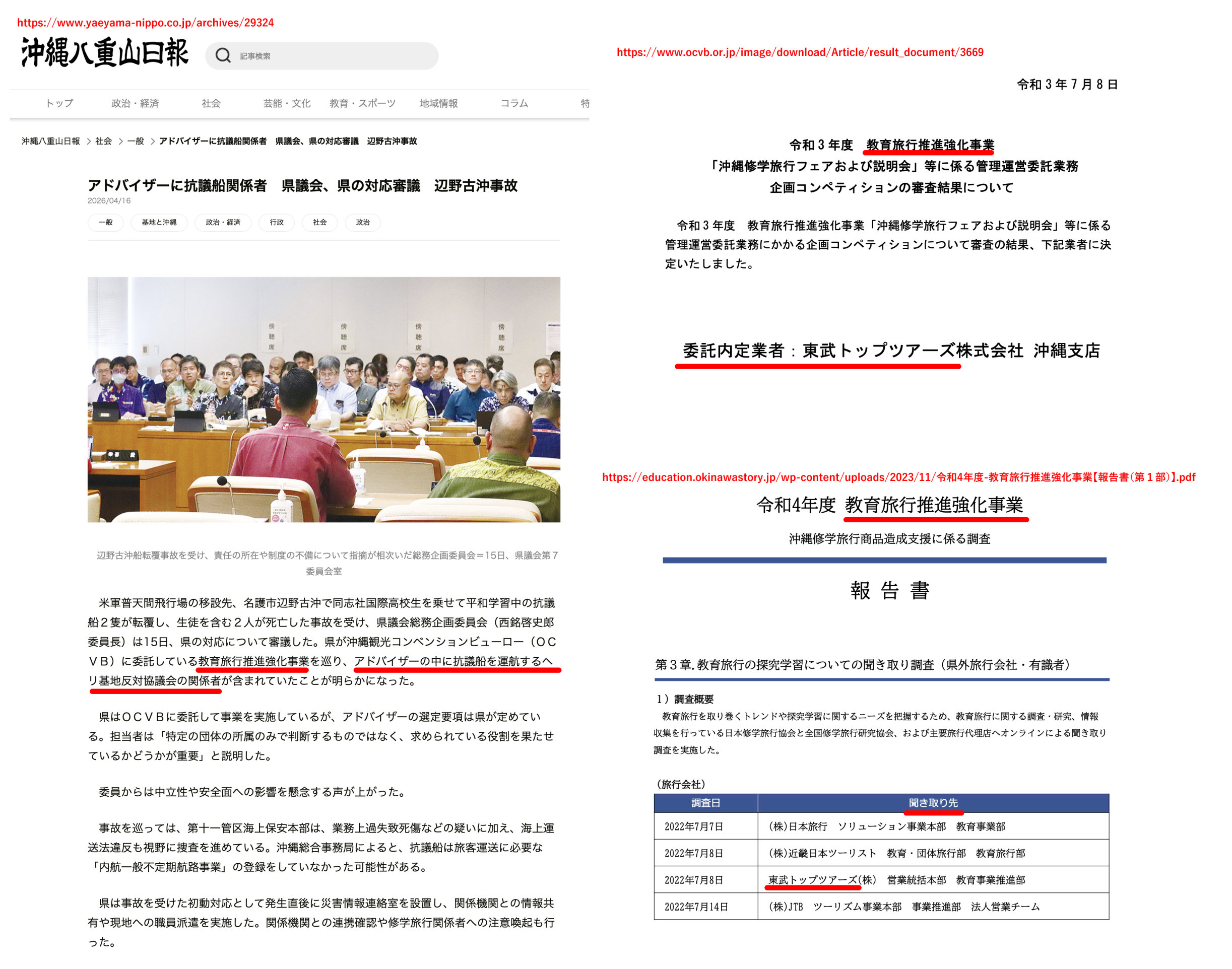 | … | 62無念Nameとしあき26/04/20(月)06:34:20No.1402146561+事故当日の協議会の会見に続き、翌日に同志社国際高等学校が記者会見を行い、それぞれ謝罪した。学校側が明らかにしたところでは、今回の抗議船乗船には旅行会社は関与していなかったこと、毎年教師3人が夏休みに行程を下見しており、過去には船に乗ったことがあったものの今年は乗っていなかったこと、生徒および保護者には抗議船とは伝えず「基地反対を唱えている方々が普段乗っている船」として伝え、乗船には保護者からの同意などはとっていないことなどが明らかになった |