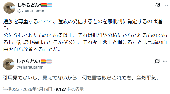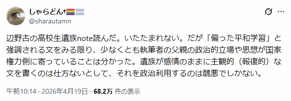 | … | 80無念Nameとしあき26/04/20(月)06:47:20No.1402147357そうだねx8遺族にしてみれば死んだ後も利用されるようなもんなんだが |