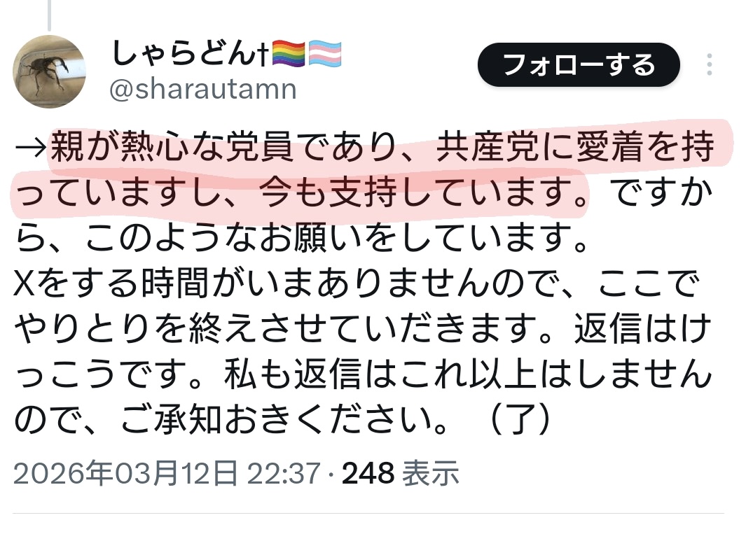 | … | 72無念Nameとしあき26/04/20(月)06:41:48No.1402146999そうだねx23別に偽装してまで共産党叩きたいってことじゃないんだよ |