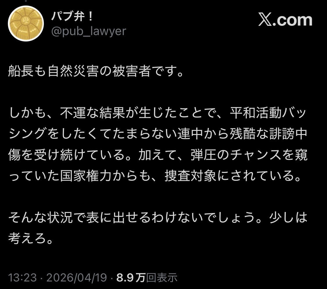 | … | 945無念Nameとしあき26/04/20(月)13:54:05No.1402203994そうだねx1>海保が迅速に対応したからだね |