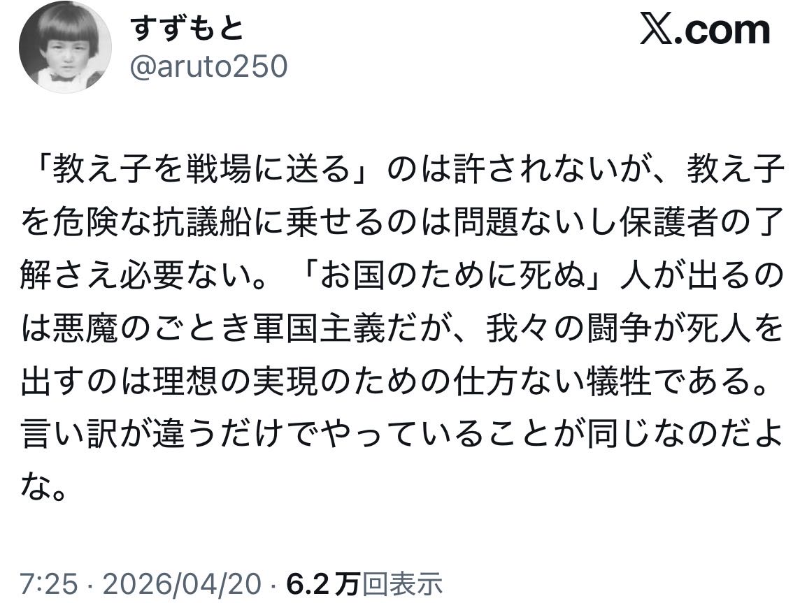 | … | 58無念Nameとしあき26/04/20(月)06:28:27No.1402146241+>>学校、旅行会社と共に生徒を騙して抗議船に乗せておいて俺達には罪はないっておかしいわ |
