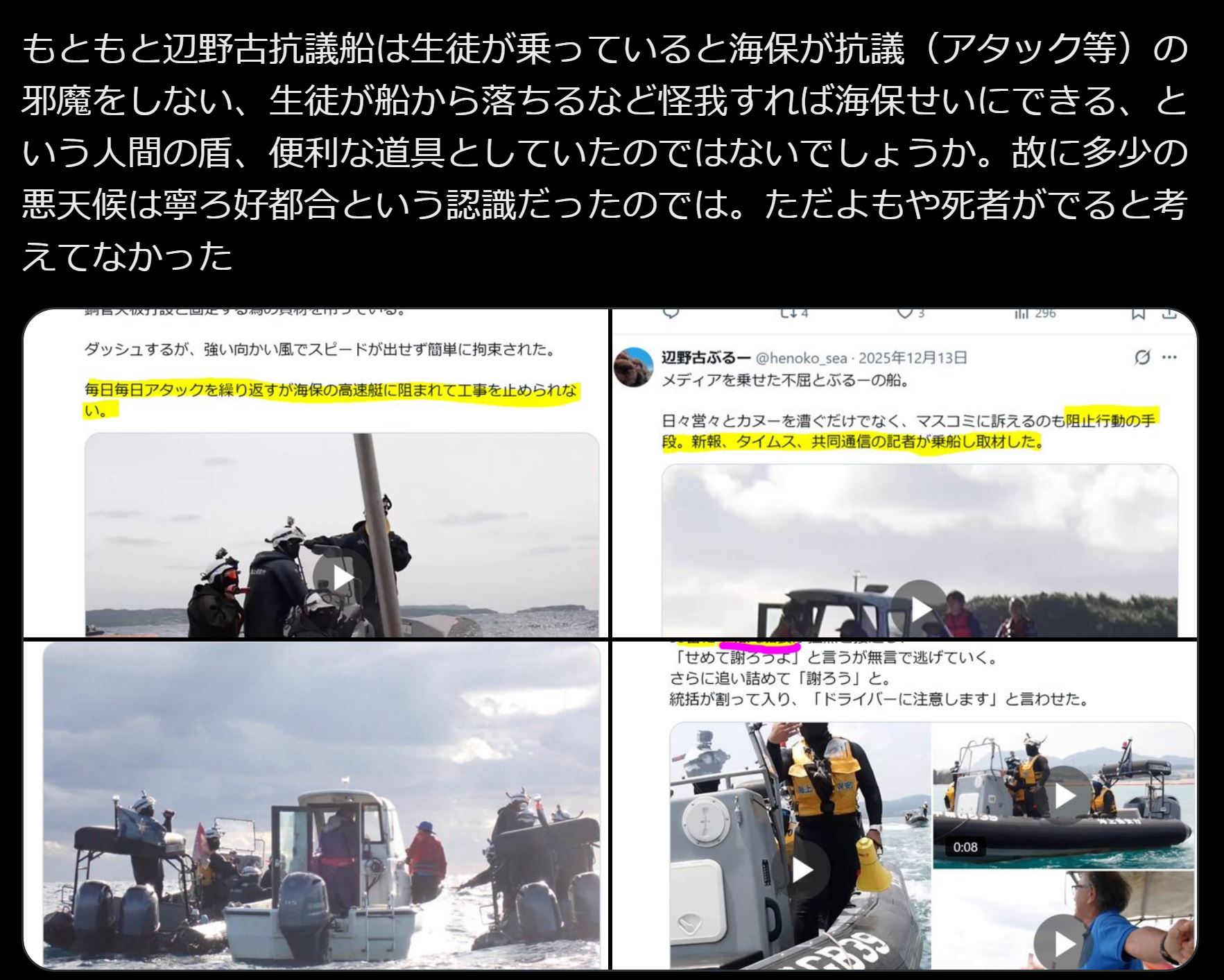 | … | 19無念Nameとしあき26/04/20(月)05:47:38No.1402144532+ 1776631658169.jpg-(15734 B) 沖縄辺野古沖転覆事件 ヘリ基地反対協議会の『◯◯映像』が流出で大炎上 【沖縄辺野古沖転覆事件】2026年4月19日 |