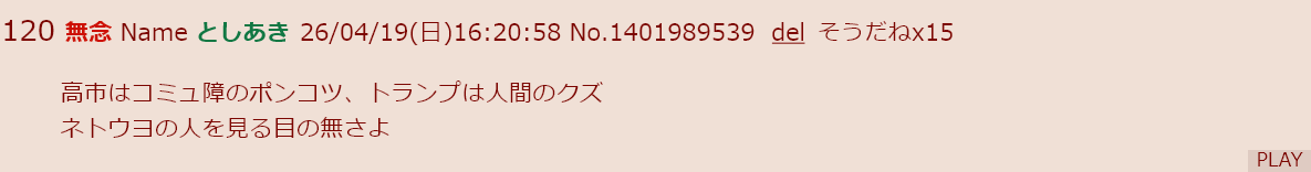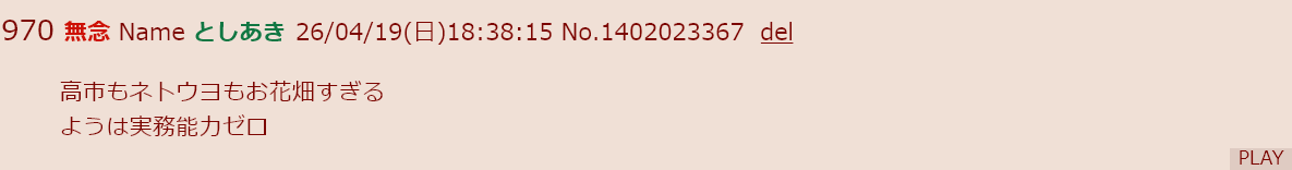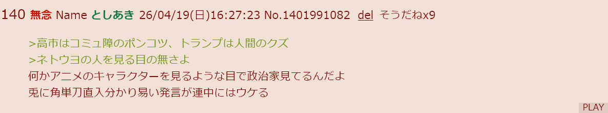 | … | 40無念Nameとしあき26/04/20(月)06:07:44No.1402145308+ネットでの批判は老人だから影響力は一切理解出来てないが |
