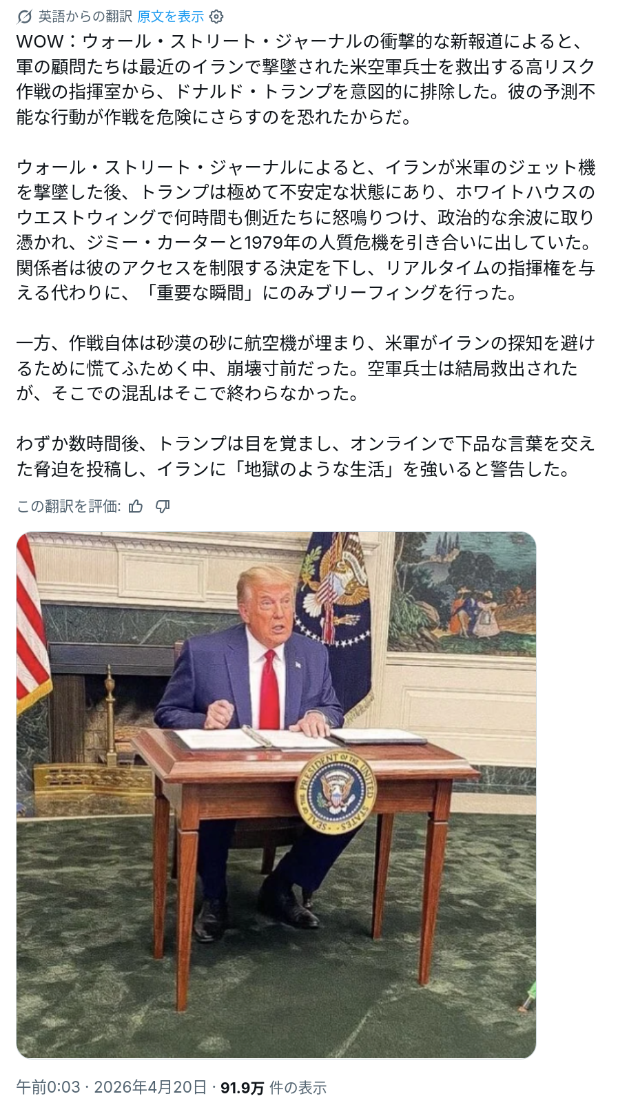 | … | 16無念Nameとしあき26/04/20(月)10:24:47No.1402169877+大統領も人間だから最悪のシナリオ延々と聞かされるより最終決定のOK出すだけに絞った方が精神上ましだろう仕事は戦争だけじゃないし |