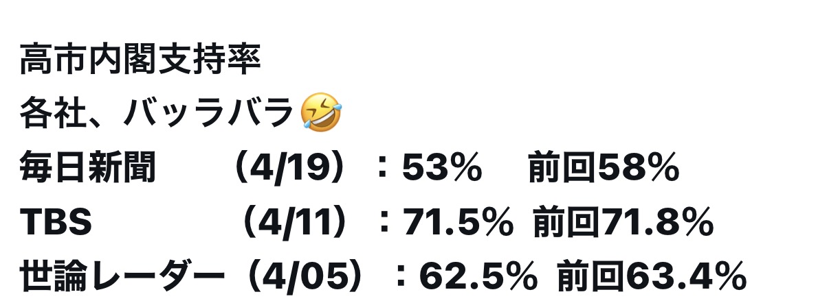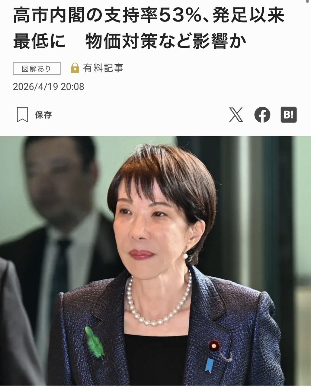 | … | 127無念Nameとしあき26/04/20(月)10:42:34No.1402172179+どこも落ちてるから衆院直後の無敵モードみたいな支持率はもうないよ |