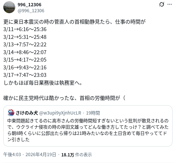 | … | 98無念Nameとしあき26/04/20(月)10:08:56No.1402167930+働いて働いて働いて参りますと言いながら働かない何なの? |