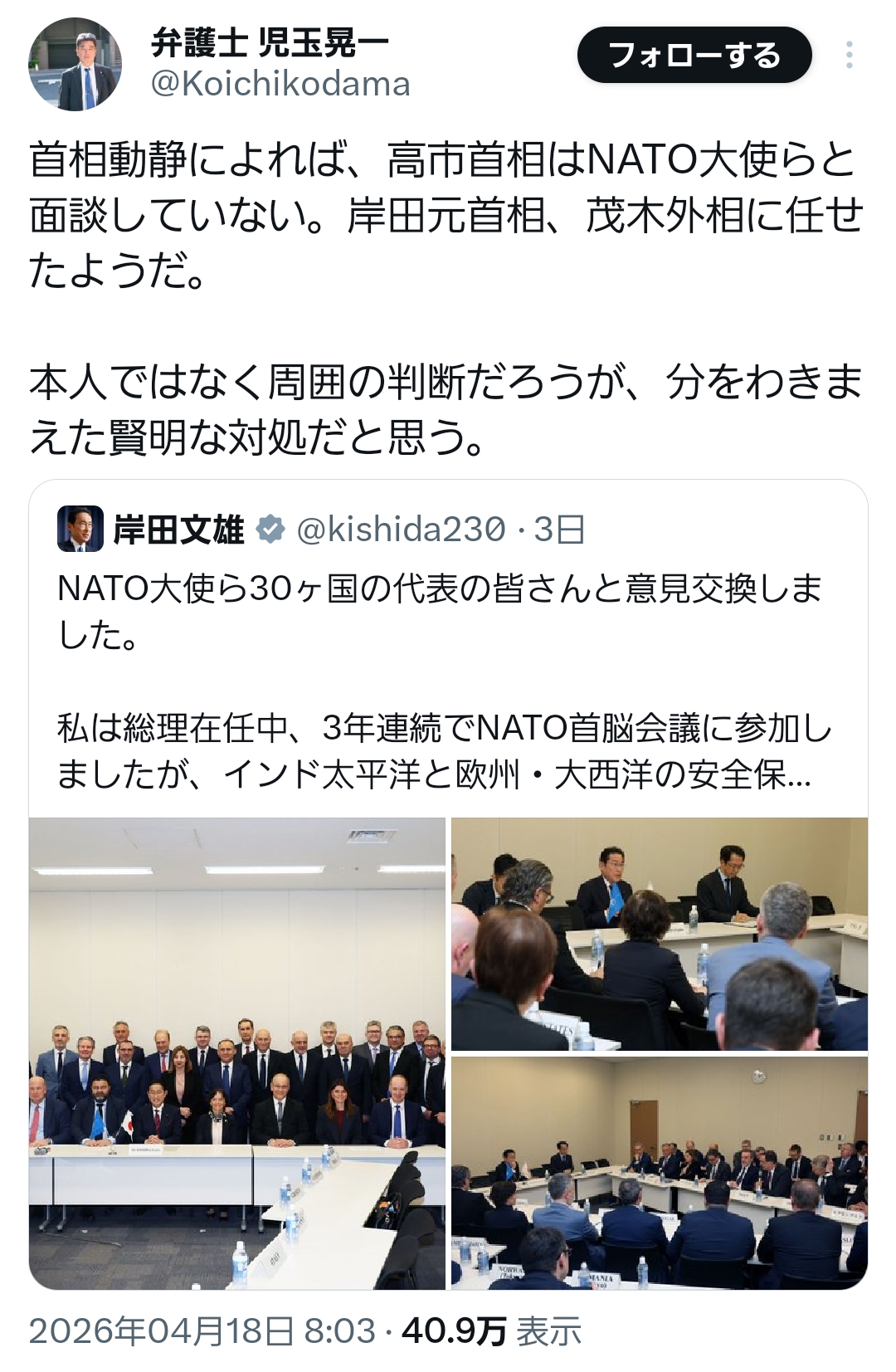 | … | 99無念Nameとしあき26/04/20(月)10:09:40No.1402168024+NATOの加盟国大使がきても対応するのは岸田や外相 |